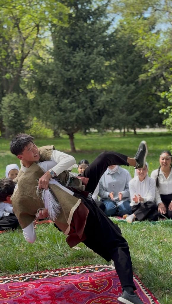 Студенттер улуу “Манас” эпосунан, анын ичинде “Көкөтөйдүн ашы” бөлүгүнөн үзүндүлөрдү көркөм айтып беришип, өздөрүнүн чеберчилигин, сөз байлыгын жана сахна маданиятын жогорку деңгээлде көрсөтө алышты. Манас айтуу аркылуу алар кыргыз элинин тарыхын, дүйнө таанымын жана баалуулуктарын терең ачып берип, угармандардын зор кызыгуусун жаратты. Иш-чара Манас айтуу менен гана чектелбестен, ачык асман алдында улуттук оюн-зооктор уюштурулду. Мындан тышкары, каада-салттар жана үрп-адаттар сахналаштырылып, ата-бабалардан калган мурастар жандуу түрдө көрсөтүлдү. Бул көрүнүштөр студенттердин улуттук баалуулуктарга болгон кызыгуусун арттырып, катышуучуларга көтөрүңкү маанай тартуулап, биримдикти, патриоттук сезимди жана улуттук сыймыкты бекемдеди.